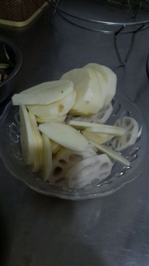 准备好所有原材料,清洗干净,分别切好备用,腐竹泡发后切成段,藕片、土豆切好后浸泡在水中防止氧化;