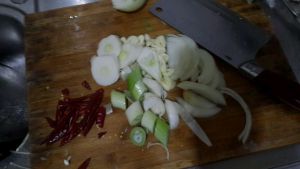 把青菜,花菜都切好,葱姜蒜干辣椒都切好。