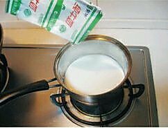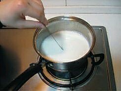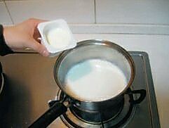 把牛奶倒入奶锅内,并加入白糖煮开。