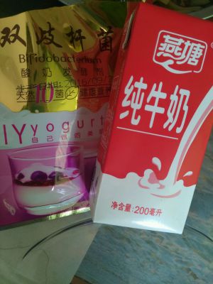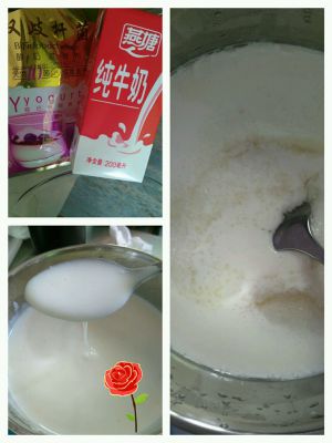 然后将煮开的牛奶放凉至不烫手后倒入酸奶。