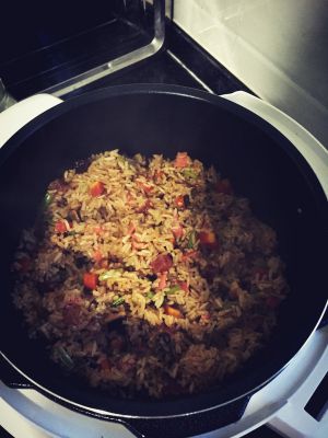 大火炒之熟了,然后加入盐,鸡精,酱油,少许糖,还有蚝油,翻炒几下后,加入少许水,焖一下,后尝一下味道,比平时口味咸些后,加入,葱,香菜后,就可以把它们倒入煮好的白米饭里,然后搅拌均匀,再放回电饭锅,焖几分钟,收汁,然后就可以吃了。