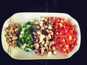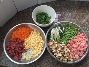 先把所有材料切成丁,备用。还要另外用电饭锅煮一锅饭备用