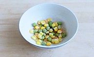 取一碗,抹薄薄一层油,底部铺上玉米粒、甜豌豆粒、金桔