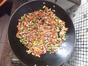 玉米,胡萝卜跟米饭一起煮,煮熟了,倒锅里炒