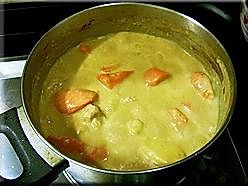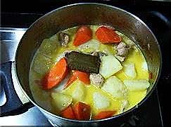 清水煮干之后,把一盒250ml的鲜奶全部倒入,并加入咖喱块,没有咖喱块可以直接放咖喱粉
