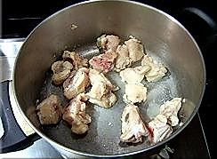 先在干净油锅中下适量油和鸡块,将鸡块炒干水分。盛起待用