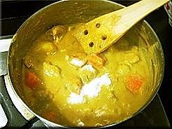觉得咖喱块不够的,可以继续放入,我在最后的时候放了10g咖喱粉,颜色会比咖喱块好看些。待到颜色和口味都达到要求了,汁也收到一半的时候,加入椰粉,搅拌均匀即可起锅