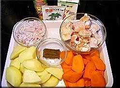 1.热锅倒入适量的油,倒入洋葱和蒜沫,翻炒出香味后倒入鸡肉块、土豆、胡萝卜。倒入适量的咖喱块,并加适量的水再加一盒牛奶(根据个人的口味)中火慢炖。