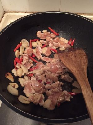 锅内放入大蒜 米椒 爆香!放入鸡肉 依次加入黑胡椒 料酒 再加入蔬菜们