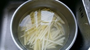 切成长条状,不要超过一厘米,(太小了也不行哦,油炸过会缩水)放入水里泡十分钟左右,去除淀粉。