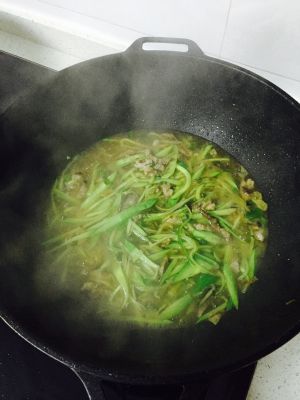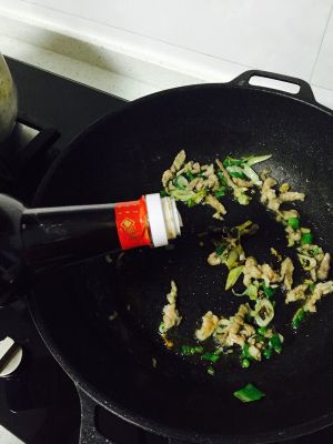 热锅加油,葱 肉爆锅,肉变色后加入一点酱油。翻炒,放入黄瓜。
