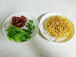准备好原料,猪肉和黄瓜切丝,葱切丝。