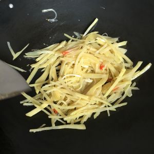 再放土豆丝爆炒到变色,放进盐、酱油、白糖、醋翻炒片刻即可出锅