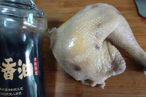 拿出鸡腿(家里有鸡爪爪的也可以加进去)用清水浸泡20min,泡出血水,清洗干净后,鸡腿冷水下锅,加入一勺料酒、2片姜,煮20min后关火放锅里闷10min(煮好的鸡汤别倒掉!)