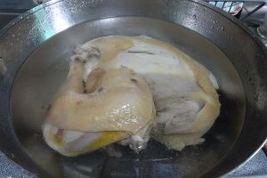 公鸡入沸水锅煮15分钟,加入一饭碗凉水,煮开,将鸡翻面再煮10分钟 再加入一饭碗凉水,煮开翻面,用竹签刺入肉厚处无血珠冒出时即可捞起