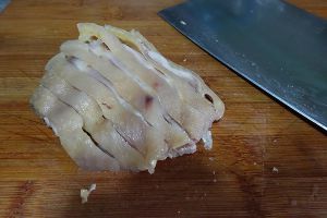 将鸡腿骨头去掉,用木棒轻轻敲打,然后撕成条