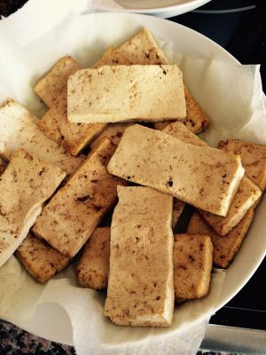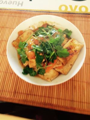 豆腐切小丁,备好花椒,糖,葱花,姜