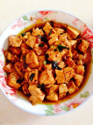 油锅热后,放入葱,姜,花椒,爆香后放入豆腐