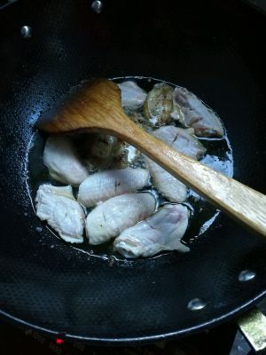 起锅烧油,油温五成热里八角干辣椒姜片,鸡翅煎至两面金黄,