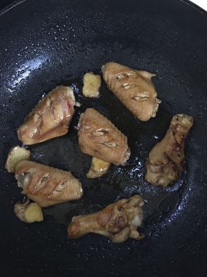 不粘锅里加入少许油,油热后放入鸡翅,用中小火煎香,如果用的普通铁锅,刚放入鸡翅的时候最好晃动一下锅子,这样鸡翅就不会粘锅了。