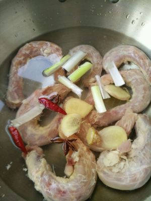 把洗干净的鸡脖和葱姜,大料,干辣椒,还有放点料酒一通放入冷水锅里炒熟,去血沫,腥味