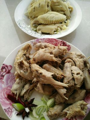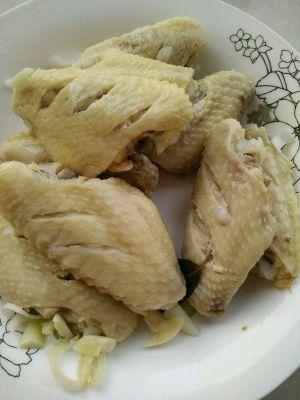 我们用手把刚才煮好干净的鸡脖用手掰成小段,在切少许葱末,还有昨天的鸡翅中放在一起