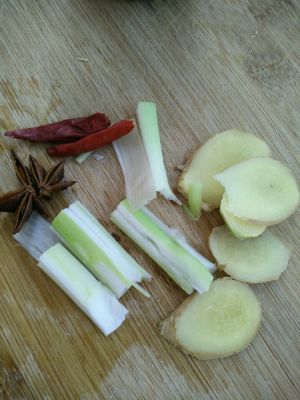 接下来,把葱切段,姜切片,准备大料一颗,干辣椒两个,这是准备焯鸡脖用的