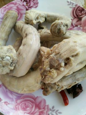鸡脖焯熟以后,洗干净表面的薄膜,把刚刚煮鸡脖用的大料和干辣椒留下来,也洗下