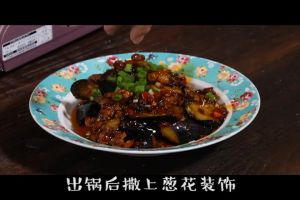 放入炸好的茄子和调成的碗汁,翻炒到汤汁浓稠即可,出锅后加入少量葱末装饰