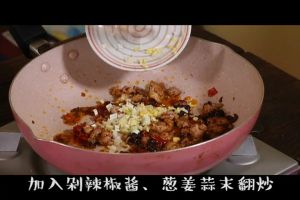 锅烧热加入食用油,放入肉馅搅拌翻炒,在加入郫县豆瓣酱,加入剁辣椒酱和葱姜蒜末进行翻炒