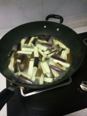 两三分钟后加入煮好的茄子 最后滴点酱油以及料酒 再加入适量的盐即可起锅