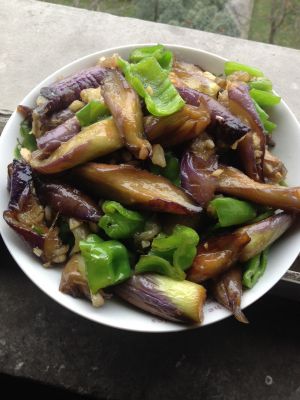 第二步:油锅烧热倒入少许油!待油加热一小会向锅中放点白砂糖!糖融化后放入茄子、茄子变的8成熟时放入切好的青椒同时向锅里倒入老抽(其为了上色和鲜)、香醋!茄子炒至完全熟透至金黄色后,勾芡出锅!注:不用加盐了因为茄子在出水的时候盐已经入到茄肉里面了!