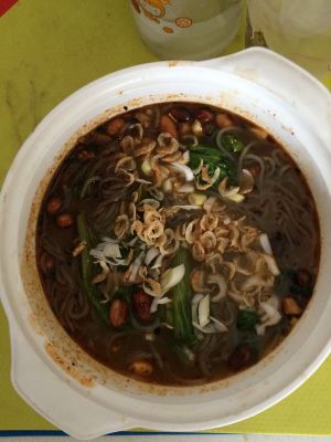 5.将调好的辣椒油,花生,肉末依次放入大碗中,依个人口味倒入陈醋,蒜末,味极鲜,麻油,盐,调制好底料 6.调制底料的同时把高汤倒入锅中煮沸后放入红薯粉,煮至可用筷子夹断时捞去放入装有底料的大碗 7.把生菜放入汤中煮约半分钟,将汤连同生菜一起倒入碗中 8.撒入葱花末,虾皮,(不爱吃香菜)完工~