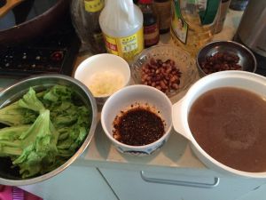 把干粉时间着急的用温水泡软。时间不急的可以用凉水泡软。我用的凉水 把青菜 黄豆芽洗净备用 大蒜切碎待用肉切条