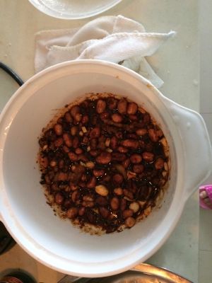 油出来豆子也差不多了。放上一小勺醋翻炒几下放入豆瓣酱 我家有孩子我放的少 喜欢吃辣的朋友可以多放 在炒肉时也可以放点辣椒