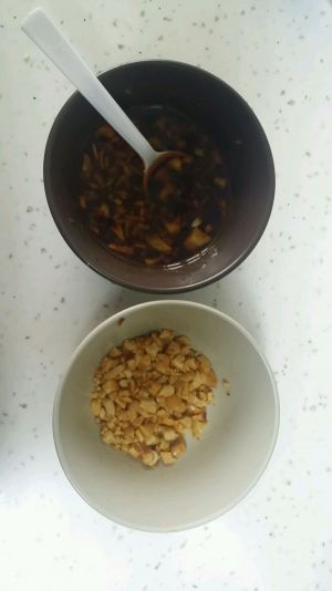 把生抽,老抽,白糖,醋,辣椒油,花椒粉,胡椒粉,香油,蒜泥,葱末,放到小碗里调成料汁。把花生弄成花生碎。(我一般都是买麻辣花生,这样方便)。