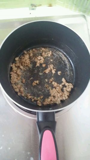 因为晚上吃冬瓜丸子汤,我就用一点点肉馅炒了一下,放半奶锅水,把浓汤宝放里煮沸。