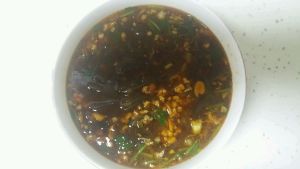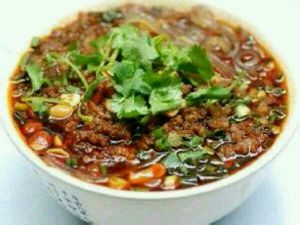 粉煮好后放在碗里,(有高汤的可以加入高汤,没有的可以提前将肉沫留一点熬汤,)淋汤,放酱油,醋,加辣椒油,蒜水,哨子,葱,香菜,完工