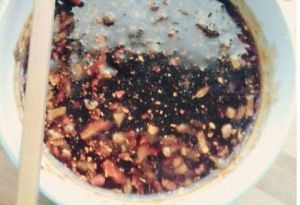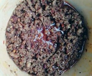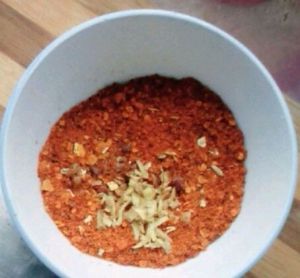 姜蒜切细,八角茴香桂皮花椒碾碎放入辣椒面