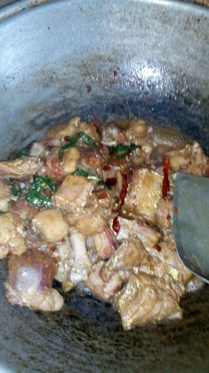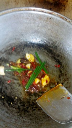锅中放油,油热后,调小火,加入豆瓣酱翻炒两下,加入辣椒,花椒什么的爆香