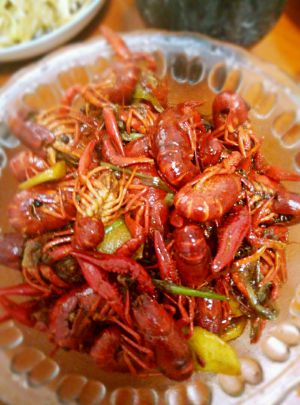 把配料准备好备用!油烧热把龙虾过油炸一分钟捞出控油,锅里加入少许油加入配料爆炒出香味把龙虾倒入翻炒均匀加入啤酒一罐清水一小碗翻炒均匀盖上锅盖中小火炖十几分钟