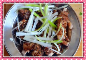 最后把味汁浇在鸡肉上,放上大葱丝,虽然卖相不怎么地,可是很下饭哟。