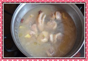 锅中加水烧沸放入鸡腿料酒和生姜,中大火煮十五到二十分钟后再盖锅焖十分钟