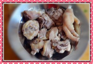 捞出鸡腿放入凉开水使肉紧致后剁块备用