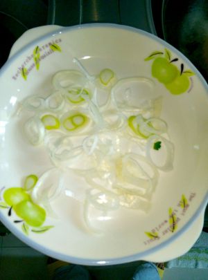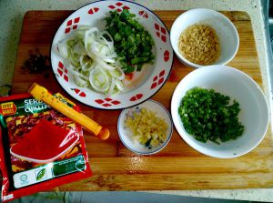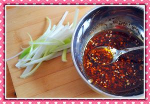 LZ比较懒,大葱是用剪刀剪成丝的。 白糖、盐、味精、辣椒油、酱油、蒜末、醋调成味汁。 辣椒油是LZ前日做好的,用辣椒粉、花椒粒、盐、白芝麻浇热油。