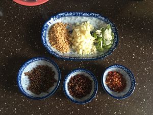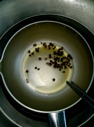 锅中放入适量的色拉油,放入剩下的花椒爆香,然后将花椒捞出,将炸好的花椒油倒入辣椒面和麻椒中,(你也可以购买现成的麻油,个人觉得还是自己做麻油比较香)