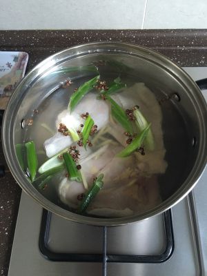 将鸡腿洗净放入冷水中,放入葱、姜、花椒。水烧开后,小火再煮5分钟,关火焖15分钟。这个可以根据自己喜欢口感,选择肉的熟烂程度。最后一步记得要把煮好的鸡腿放在冷开水里啊!这样会增加外皮的弹性口感