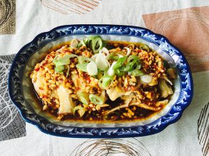 料汁:热油锅下入蒜末和切成小段的小米辣、绿尖椒,煸炒出香味后浇到干辣椒面、白芝麻上,随后加入酱油、老抽、香醋、蚝油、白糖和一大勺白开水即可。