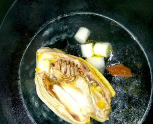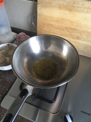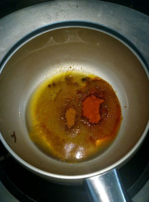 再加入芝麻油加热,加黄姜粉辣椒粉爆香