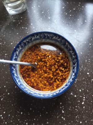 在辣椒油中倒入蒜末、糖、盐、香醋、麻油、酱油,我这次还在里面添加了原有的鸡汤,但是老公说加了鸡汤后料有点稀了,味道没那么浓郁了。